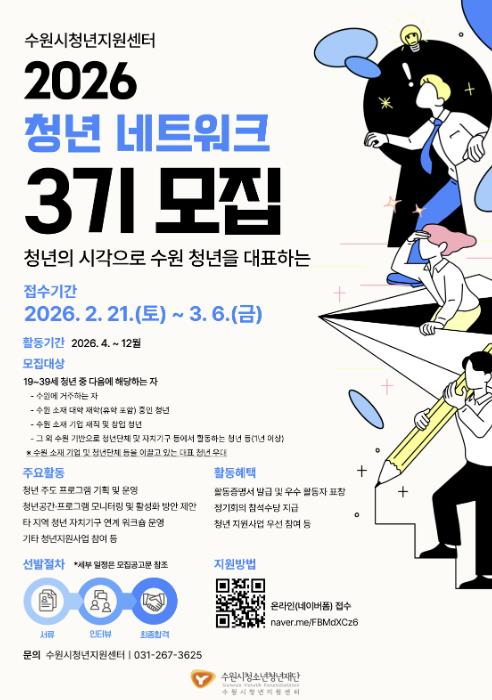 [파이낸셜경제=김기보 기자] 수원시청소년청년재단 수원시청년지원센터는 2월 21일부터 3월 6일까지 2026년 청년 네트워크 단원 32명을 모집한다.