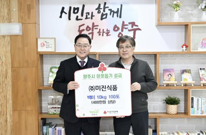 [파이낸셜경제=김기보 기자] 양주시는 최근 ㈜미진식품로부터 이웃돕기 성품으로 백미 10kg 100포(400만 원 상당)를 기탁받았다고 밝혔다.
