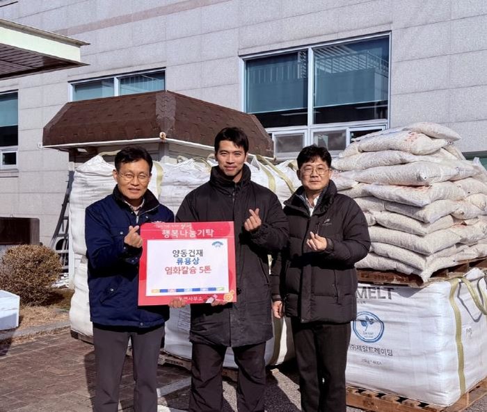 정창업 양동면장은 “겨울철을 앞두고 어려운 이웃과 주민 안전을 위해 제설 자재를 기탁해 주신 양동건재 류용상 씨께 깊이 감사드린다”며 “기탁해 주신 염화칼슘은 꼭 필요한 곳에 소중히 사용하겠다”고 전했다.