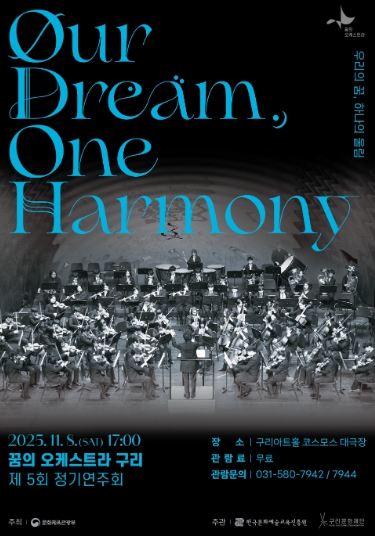 ‘2025 꿈의 오케스트라 구리 제5회 정기연주회’는 11월 8일 오후 5시, 구리아트홀 코스모스 대극장에서 개최되며, 이번 공연의 주제는 ‘우리의 꿈, 하나의 울림’이다. 단원들의 꿈과 열정이 하나로 어우러지는 순간을 관객과 함께 나누며, 음악을 통해 희망과 감동을 전할 예정이다.