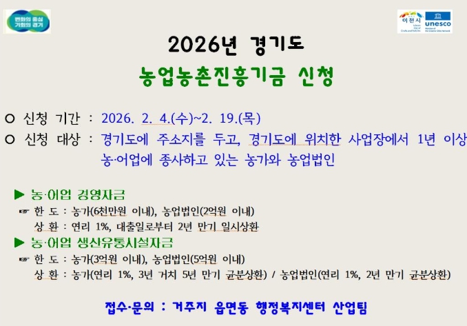 [파이낸셜경제=김기보 기자] 이천시는 농업인에게 장기·저리 융자 지원을 실시하고 경영안정을 돕기 위해 2026년 경기도 농업농촌진흥기금 농어업 경영자금, 농어업 생산유통시설자금 사업에 대한 신청을 2월 3일부터 접수한다.