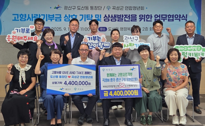 [파이낸셜경제=김예빈 기자] 광주 광산구 도산동 통장단(단장 박창곤)과 전남 곡성군 연합청년회(회장 오종국)가 지난 12일 도산동 행정복지센터 2층 회의실에서 고향사랑기부제 상호 협약을 체결했다.