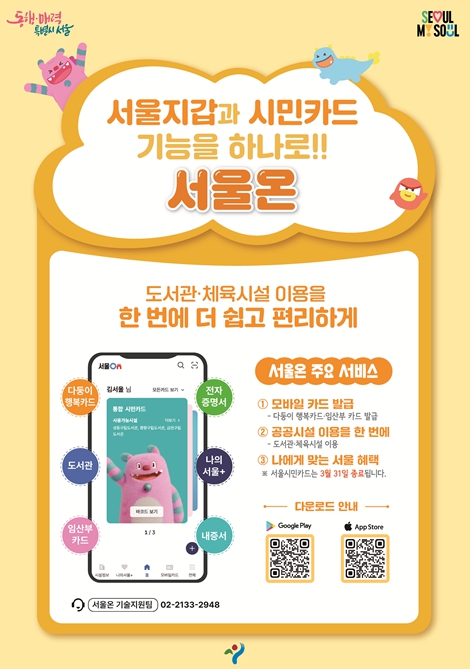 [파이낸셜경제=김예빈 기자] 서울시 모바일 행정서비스가 하나의 앱으로 통합된다. 서울시는 공공시설 이용을 위해 운영해 온 ‘서울시민카드’ 모바일 앱 서비스를 3월 31일 종료하고 관련 기능을 서울시 통합 모바일 플랫폼 ‘서울온’으로 일원화한다고 밝혔다.