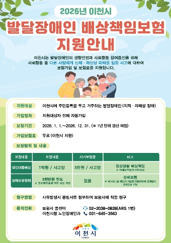 [파이낸셜경제=김기보 기자] 이천시는 2026년 1월 1일부터 경기도 최초로 발달장애인을 위한 배상책임보험 가입 지원을 시행한다고 밝혔다.