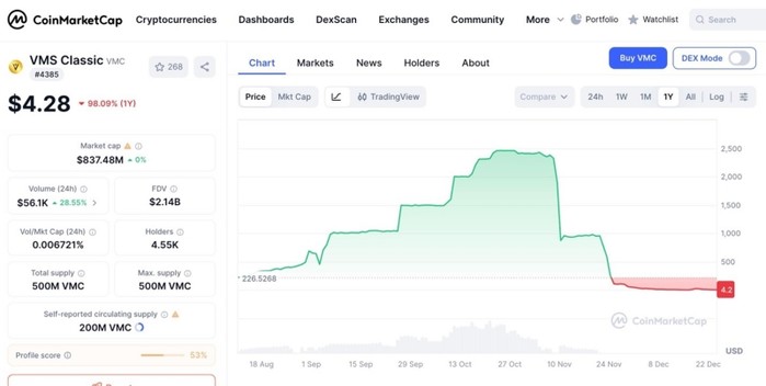 | ▲ 출처 : 코인마켓캡 / 최대 $2,400 선까지 갔던 VMC코인이 폭락한 모습 |