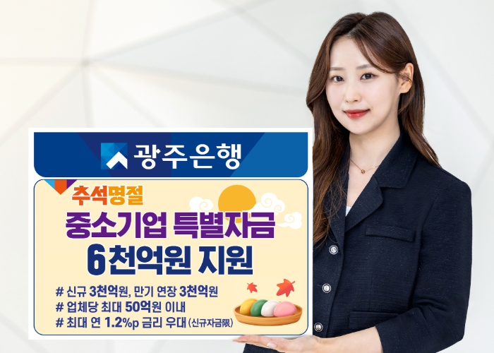 [파이낸셜경제=김예빈 기자] 광주은행은 추석 명절을 앞두고 자금 수요에 어려움을 겪는 지역 중소기업과 소상공인을 위해 총 6천억 원 규모의 ‘추석 명절 중소기업 특별자금’을 지원한다고 지난 15일 밝혔다.