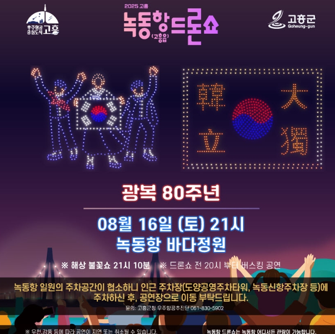군 관계자는 “광복 80주년이라는 뜻깊은 해를 맞아, 군민과 고흥을 찾는 관광객에게 잊지 못할 추억을 선사하겠다”며 “관람객 모두가 나라 사랑하는 마음을 되새기는 시간이 되길 바란다”고 말했다.