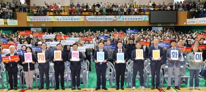 | ▲ 18일 정읍시 국민체육센터에서 열린 2025 전북자활 어울한마당에 김관영 도지사와 임승식‧염영선 도의원, 정읍시장 및 도내 17개 지역자활센터 종사자와 참여자를 비롯해 약 1,800여명이 참석한 가운데 퍼포먼스를 하고 있다. |