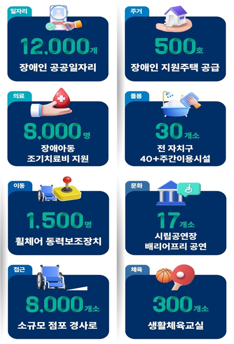 이외에도 걱정 없이 오래 거주할 수 있는 주거공간과 돌봄시설은 물론AI와 로봇기술을 접목한 첨단보행 보조기기 보급, 승하차가 편한 대중교통 확대 등 단지 장애가 있다는 이유로 생활과 이동에 불편을 겪지 않도록 인프라도 갖춰나간다. 인권침해에 대해선 무관용 원칙을 적용, 든든하게 보호막이 되어준다.