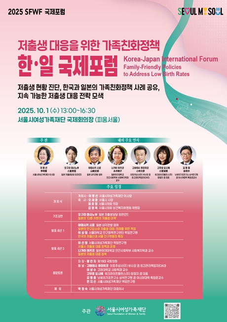 [파이낸셜경제=김예빈 기자] 서울시여성가족재단은 오는 10월 1일 오후 1시부터 4시 30분까지 서울여성플라자 국제회의장에서 '저출생 대응을 위한 가족친화정책 한·일 국제포럼'을 개최한다고 밝혔다.
