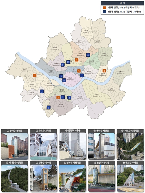 고지대 이동약자 편의시설 설치 사업은 주거지와 대중교통·공원·생활편의시설을 안전하고 편리하게 연결하기 위해 지역 특성에 맞춰 엘리베이터·모노레일 등 생활밀착형 이동시설을 설치하는 사업으로, 시는 지난해 5월 1단계 5곳(광진구 중곡동, 강서구 화곡동, 관악구 봉천동, 종로구 숭인동, 중구 신당동)을 우선 대상지로 선정한 바 있다.