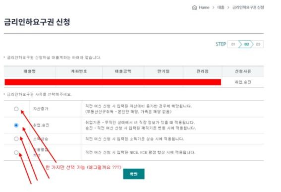 ■ (문제3) 고객이 ‘금리인하요구권’ 신청 시, 어떤 이유로 신청하는지 1가지만 선택하도록 되어 있음, 예를 들어, 취업과 신용정보상향을 이유로 신청을 하고 싶어도 한 가지 이유만 선택해야 하며, 결국 두 번 신청을 해야 한다.