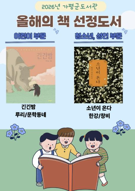 [파이낸셜경제=김기보 기자] 가평군도서관이 군민의 독서 문화 확산을 위해 ‘2026년 올해의 책’으로 루리 작가의 『긴긴밤』과 한강 작가의 『소년이 온다』를 선정했다.