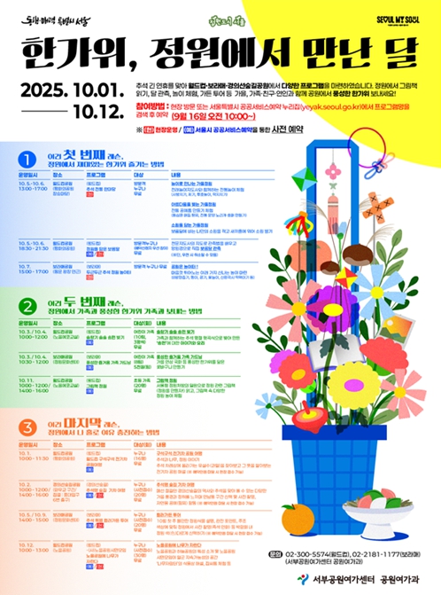 [파이낸셜경제=김예빈 기자] 선선한 가을 바람과 함께 나들이하기 좋은 추석 연휴, 가까운 자연속에서 특별한 추억을 남길 수 있도록 서울의 공원 13곳에서 42개 프로그램을 선보인다. 명절 분위기를 물씬 느낄 수 있는 민속놀이부터 공원의 자연을 느낄 수 있는 생태 관찰, 해설 산책, 전시 관람 등 다양한 즐길거리로 이번 긴 추석을 알차게 채워보자.