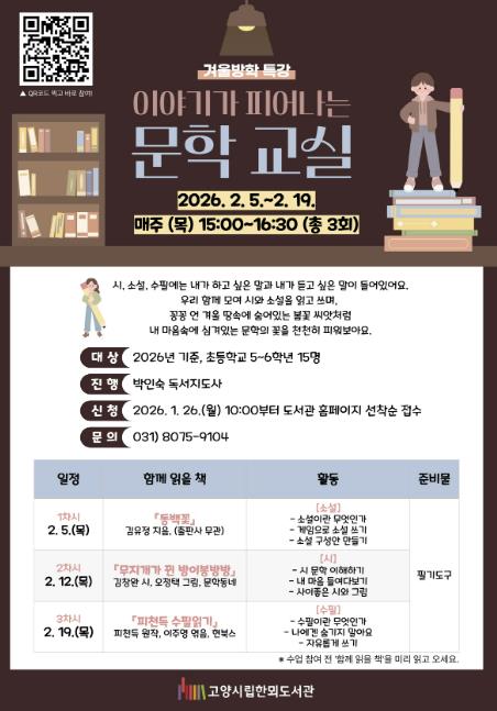 [파이낸셜경제=김기보 기자] 고양특례시 한뫼도서관은 겨울방학을 맞아 초등학교 고학년을 대상으로 한 특강‘이야기가 피어나는 문학 교실’을 운영한다.