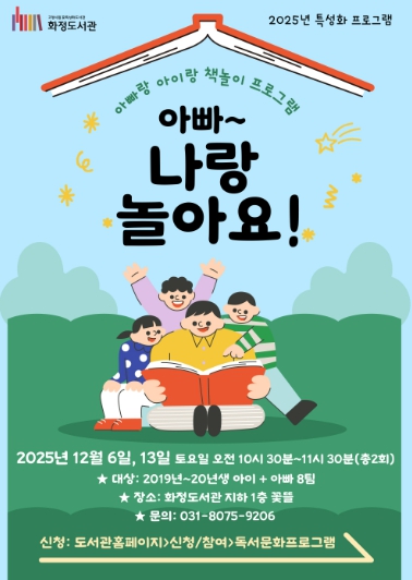 [파이낸셜경제=김기보 기자] 고양특례시 화정도서관은 오는 12월 6일, 13일 오전 10시 30분, 화정도서관 지하 1층 꽃뜰에서 특성화 프로그램 ‘아빠~ 나랑 놀아요!'를 운영한다.