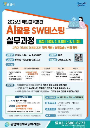 [파이낸셜경제=김기보 기자] 광명시 광명여성새로일하기센터가 오는 3월 3일까지 정보기술(IT) 품질관리 분야 취업을 희망하는 ‘인공지능(AI) 활용 소프트웨어(SW) 시험(테스팅) 실무과정’ 교육생을 모집한다.
