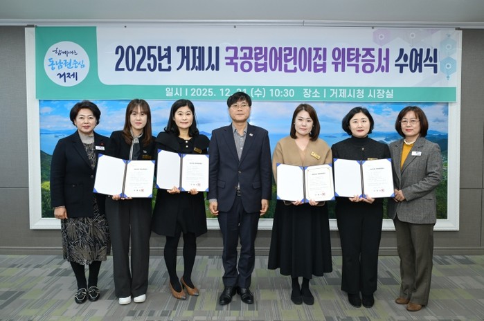 [파이낸셜경제=김예빈 기자] 거제시는 12월 31일, 시장실에서 국공립어린이집 수탁자로 선정된 어린이집에 위탁계약증서를 수여했다.