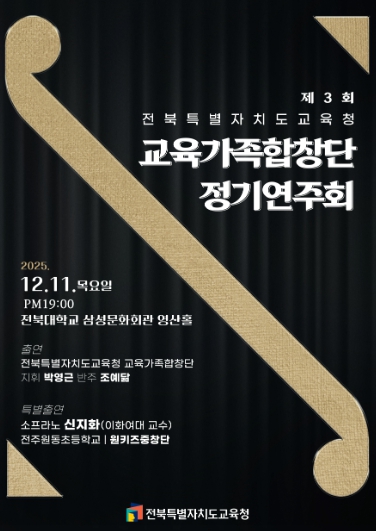 [파이낸셜경제=김예빈 기자] 전북특별자치도교육청은 오는 11일 오후 7시 전북대학교 삼성문화회관에서 ‘제3회 전북특별자치도교육청 교육가족합창단(이하 교육가족합창단) 정기연주회’를 개최한다고 밝혔다.