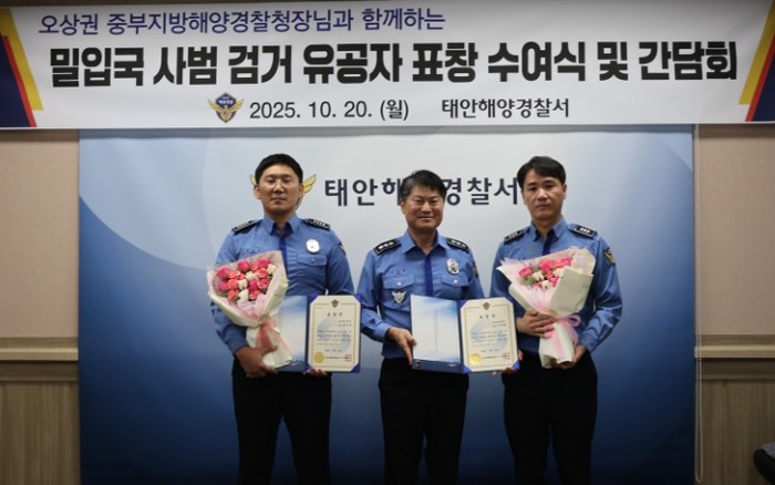 [파이낸셜경제=김영란 기자] 중부지방해양경찰청은 지난 20일, 태안해경서 소회의실에서 최근 태안 해상에서 발생한 밀입국 사범 검거와 관련해 유공자 표창 수여 및 간담회를 개최했다고 밝혔다.