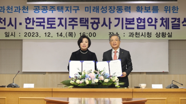 | ▲ 2023년 12월, 과천시가 한국토지주택공사와 과천과천지구 도시지원시설용지 관련 협약 체결(좌 신계용 과천시장, 우 한국토지주택공사 이한준 전임 사장) |