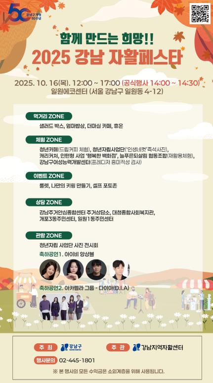 [파이낸셜경제=김예빈 기자] 꿈이 모이는 도시, 미래를 그리는 강남구가 10월 16일 낮 12시부터 오후 5시까지 일원에코센터에서 ‘2025 강남 자활페스타’를 개최한다.