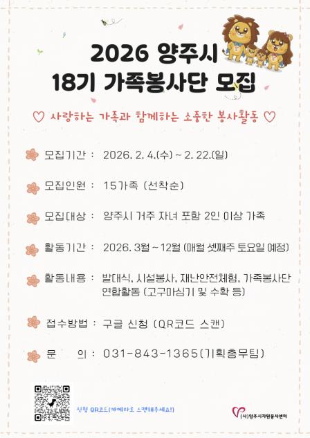 양주시자원봉사센터 이정주 센터장은 “가족이 함께 봉사활동에 참여하는 경험은 자녀에게 나눔의 가치를 자연스럽게 전달하고, 가족 간 유대감을 강화하는 계기가 된다.”며 “지역사회에 따뜻한 변화를 만들어갈 가족들의 많은 관심과 참여를 바란다.”고 전했다.