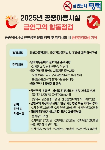 주요 점검항목은 ▲담배 자동판매기 설치기준 준수 여부 ▲금연 구역 및 흡연실 시설 기준 이행 여부 ▲금연 구역 내 흡연행위 단속 등이며, 위반 시에는 국민건강증진법에 따라 10만 원, 평택시 조례에 따라 5만 원의 과태료가 부과된다.