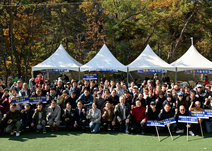 | ▲ 김동근 시장이 11월 1일 의정부시 자율방범연합대의 ‘2025년 범죄예방 캠페인 및 체육대회’에서 참여자들과 기념사진을 찍고 있다. |