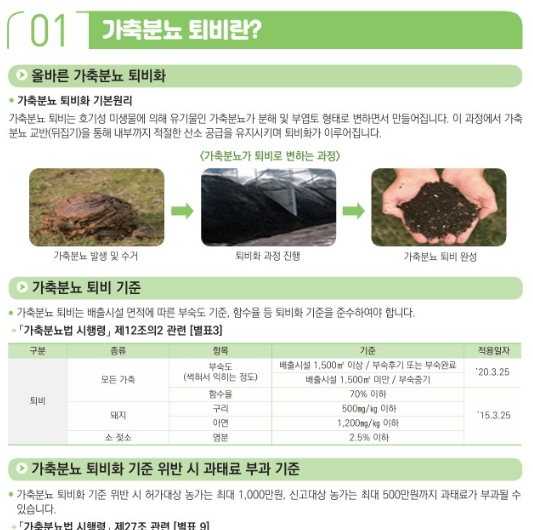 관내 축산농가 중 허가대상은 연 2회, 신고대상은 연 1회 검사 의무화 '가축분뇨의관리 및 이용에 관한 법률'에 따라 가축분뇨 배출시설 설치 및 운영자, 퇴·액비를 처리·살포하는 자는 반드시 부숙도 검사를 실시해야 한다. 특히, 퇴·액비를 외부로 반출할 때는 반드시 부숙도 검사를 완료하고 '부숙완료' 판정을 받은 퇴비만을 반출해야 법적 불이익을 피할 수 있으며, 검사를 희망하는 농가는 퇴비 더미 중 5~10군데에서 2㎏ 이상 채취해 균일하게 혼합 후 500g 가량을 정해진 시료 봉투에 담아 여주시 농업기술센터 내 종합검정실 2층에 방문·의뢰하면 무료로 검사결과를 받을 수 있다.