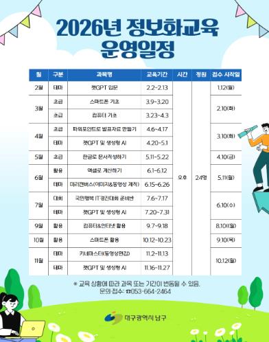 | ▲ 대구 남구는 2026년 구민 대상 정보화교육을 운영한다. 2월~11월까지 9개월간 컴퓨터, 스마트폰 등 다양한 교육을 시행하며 문의 사항은 남구청(☎664-2464)으로 문의하면 된다. |
