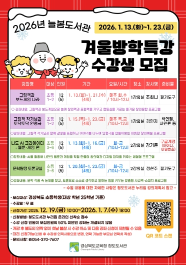 [파이낸셜경제=김지훈 기자] 경상북도교육청 청도도서관(관장 조은희)은 겨울방학을 맞아 어린이들의 창의력과 사고력을 키울 수 있는 '2026년 늘봄도서관 겨울방학특강' 수강생을 오는 12월 19일부터 모집한다.