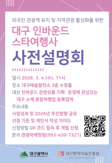 [파이낸셜경제=김지훈 기자] 대구광역시와 대구문화예술진흥원 관광본부는 오는 3월 4일 오전 11시 대구예술발전소 수창홀에서 대구 소재 종합여행업 등록업체를 대상으로 ‘2026년 대구 인바운드 스타여행사 육성사업’ 사전 설명회를 개최한다.