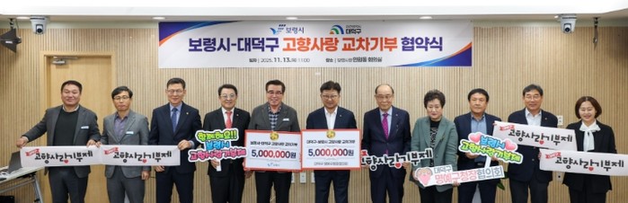 특히, 협약식에 대덕구 명예구청장협의회 회원 6명이 함께하며 보령시에 고향사랑기부금 500만원을 전달해 교차 기부의 의미를 더했다.