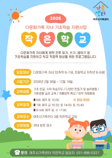 [파이낸셜경제=김기보 기자] 여주시가족센터는 다문화가족 자녀 기초학습 지원사업 ‘작은학교’를 운영한다고 밝혔다.