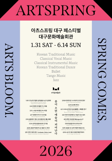 [파이낸셜경제=김지훈 기자] 대구문화예술회관은 대구를 기반으로 활동하는 지역 예술인들의 공연을 한데 모아 그들의 예술혼을 집중 조명하는 축제 '2026 아츠스프링 대구 페스티벌'의 16개 공연을 오는 1월 31일부터 6월 14일까지 대구문화예술회관에서 개최한다고 밝혔다.