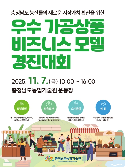 [파이낸셜경제=김영란 기자] 충남도 농업기술원은 오는 11월 7일 농가공경영체와 전문가, 일반 소비자 등 300여 명이 참석한 가운데 ‘2025년 우수 가공상품 비즈니스 모델 경진대회’를 개최한다고 30일 밝혔다.