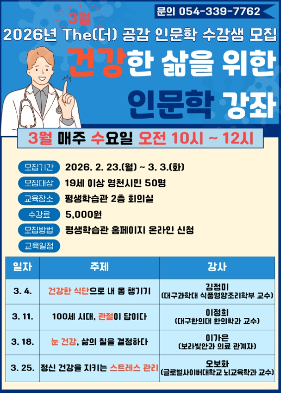 [파이낸셜경제=김지훈 기자] 영천시 평생학습관(관장 정경자)은 시민의 인문학적 소양 함양을 위해 운영하는 ‘The(더) 공감 인문학 특강’ 3월 수강생을 23일부터 다음 달 3일까지 모집한다.