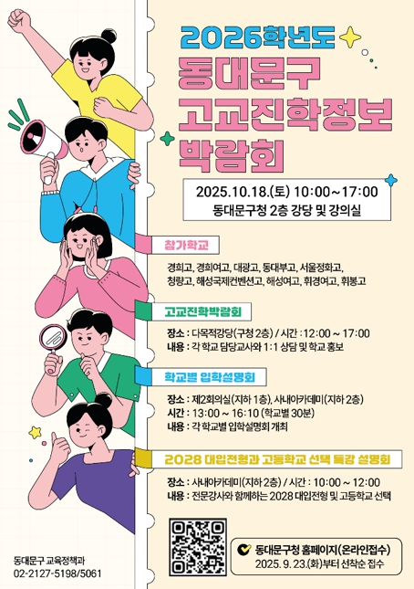 [파이낸셜경제=김예빈 기자] 서울 동대문구는 오는 10월 18일 토요일 오전 10시부터 오후 5시까지 구청 내 다목적 강당, 제2회의실, 사내아카데미에서'2026학년도 고교 진학정보 박람회'를 개최한다고 밝혔다.