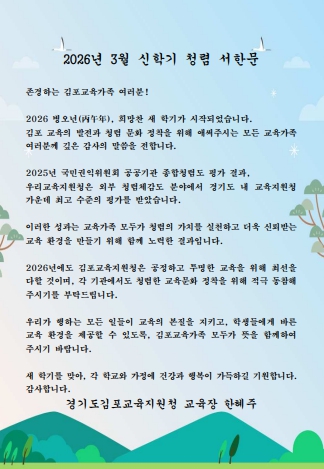 [파이낸셜경제=김기보 기자] 김포교육지원청은 2026년 3월 신학기를 맞아 관내 학교를 대상으로 ‘교육장 청렴 서한문’을 발송했다고 밝혔다.