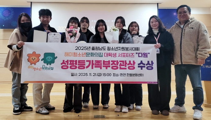 [파이낸셜경제=김영란 기자] 해미청소년문화의집은 지난 21일 성평등가족부와 충청남도가 주최한 2025년 충남청소년자원봉사대회에서 대학생 서포터즈 ‘다원’이 동아리 부문에서 성평등가족부장관상을 수상했다고 밝혔다.