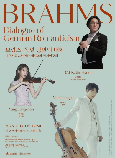 [파이낸셜경제=김지훈 기자] 두 악기가 주고받는 정교한 선율에서 오케스트라가 만드는 밀도 높은 호흡까지, 대구시립교향악단은 오는 2월 13일 오후 7시 30분, 대구콘서트하우스 그랜드홀에서 '제522회 정기연주회 : 브람스, 독일 낭만의 대화'를 선보인다.