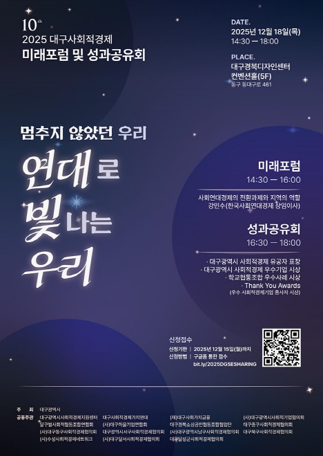 박기환 대구광역시 경제국장은 “올 한 해 어려운 경제 여건 속에서도 성장세를 이어온 것은 사회적경제 기업과 관계자들의 적극적인 노력 덕분”이라며, “앞으로도 사회적경제 기업 간 연대를 강화해 사회 변화에 능동적으로 대응하고, 지속 가능한 미래를 만들어 갈 수 있도록 지원을 아끼지 않겠다”고 말했다.