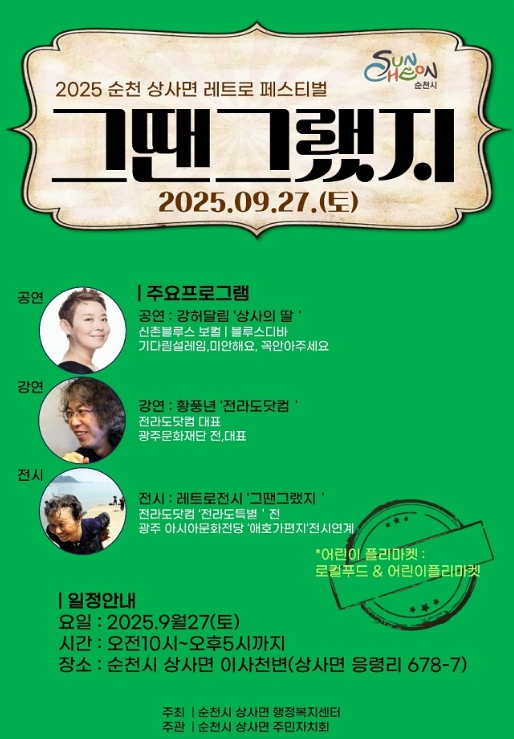 [파이낸셜경제=김예빈 기자] 순천시 상사면오는 27일 오전 10시부터 오후 5시까지 상사면 이사천 일대(상사파크골프장 내, 응령리 687-7번지)에서 '2025 상사면 레트로 페스티벌-그땐 그랬지'를 개최한다고 밝혔다.