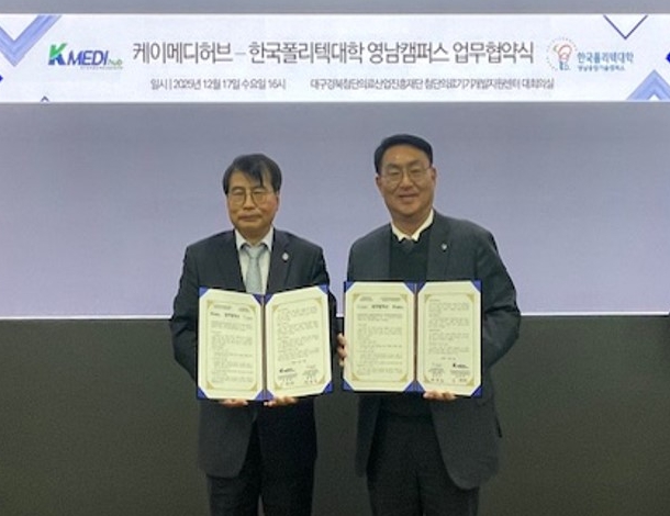 [파이낸셜경제=김지훈 기자] 케이메디허브 첨단의료기기개발지원센터는 12월 17일 오후, 한국폴리텍대학 영남융합기술캠퍼스와 인력양성 협력을 위한 업무협약을 체결했다.