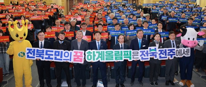 | ▲ 16일 임실군청에서 열린 '도민과 함께하는 2026년 시군 방문'에 김관영 전북특별자치도지사와 심민 임실군수 및 참석자들이 도민과의 대화 시간을 갖고 하계올림픽 유치희망 피켓을 들고 기념촬영을 하고 있다 |