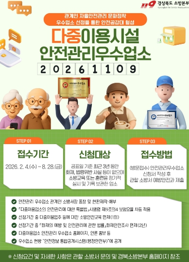 [파이낸셜경제=김지훈 기자] 경상북도소방본부는 자율안전관리 문화 정착을 위한 ‘다중이용업소 안전관리 우수업소’ 신규 신청을 오는 8월 28일까지 접수한다고 밝혔다.