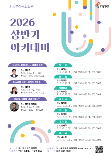 2026년 상반기 아카데미 강좌 수강 신청은 2월 11일 오후 2시부터 가능하며 강의 커리큘럼 및 강사 프로필 등 자세한 내용은 (재)부산문화회관 홈페이지 또는 전화를 통해 확인할 수 있다.