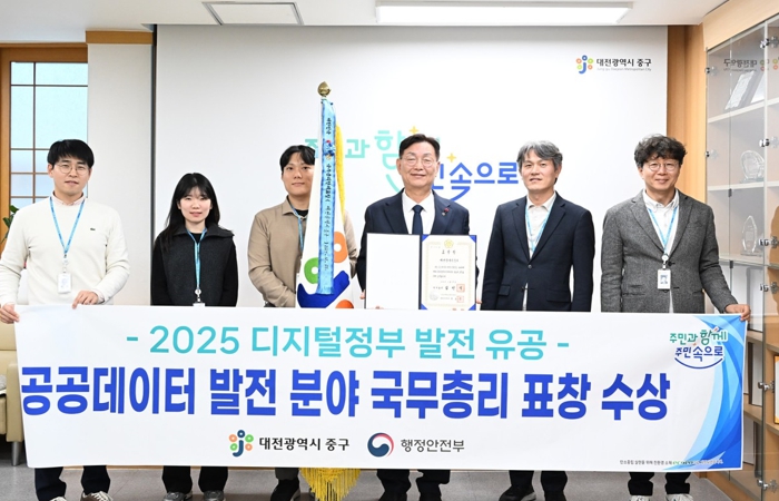 [파이낸셜경제=김영란 기자] 대전 중구는‘2025 디지털정부 발전 유공 정부포상’공공데이터 발전 부문에서 전국 기초자치단체 중 유일하게 국무총리 기관 표창을 수상했다고 4일 밝혔다.