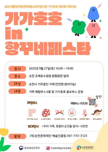 [파이낸셜경제=김예빈 기자] (재)순천문화재단은 오는 27일 조례호수공원에서 ‘2025 생활밀착형 문화예술교육지원사업 '가가호호(家加好好)'의 홍보 프로그램인 ‘가가호호 in 항꾸네페스타’를 운영한다.